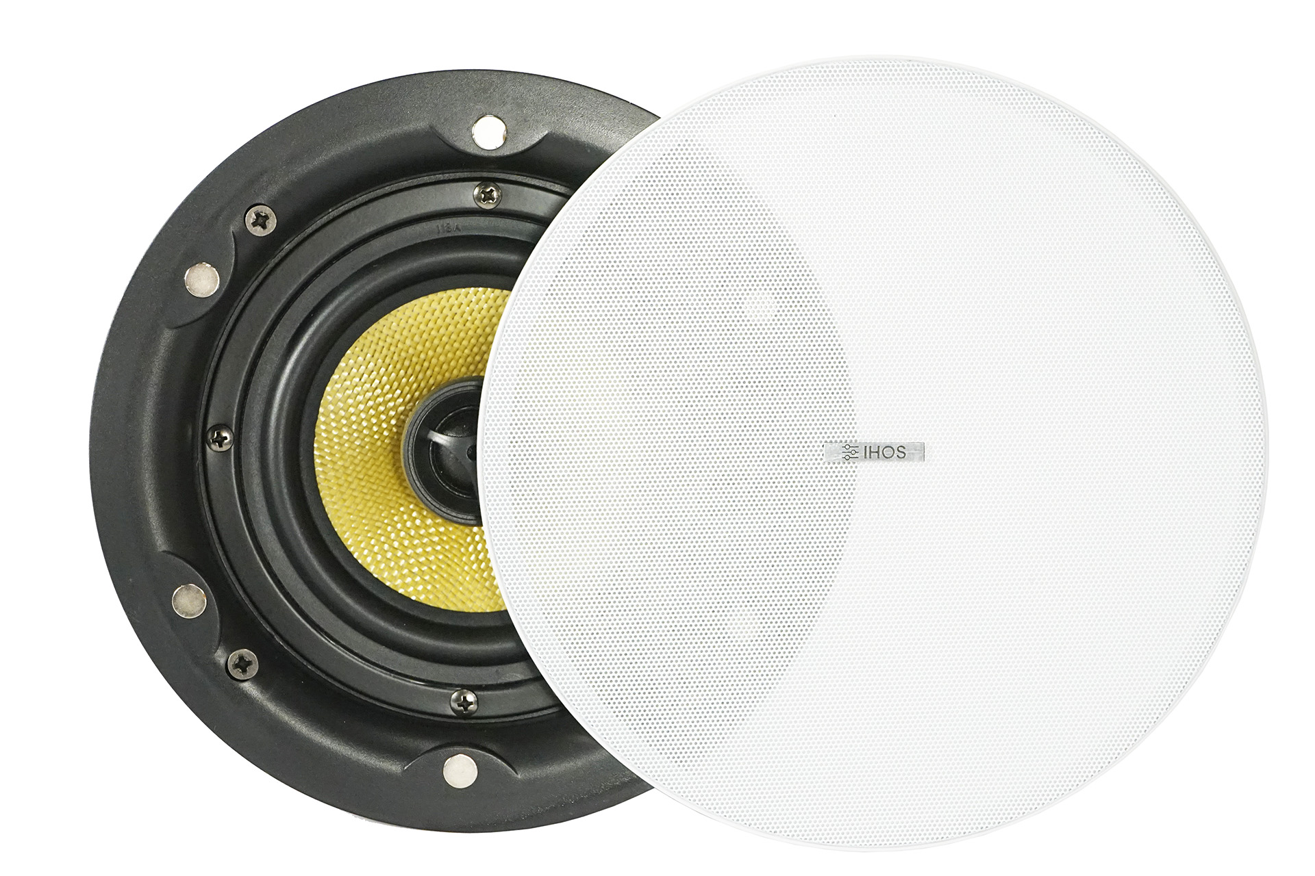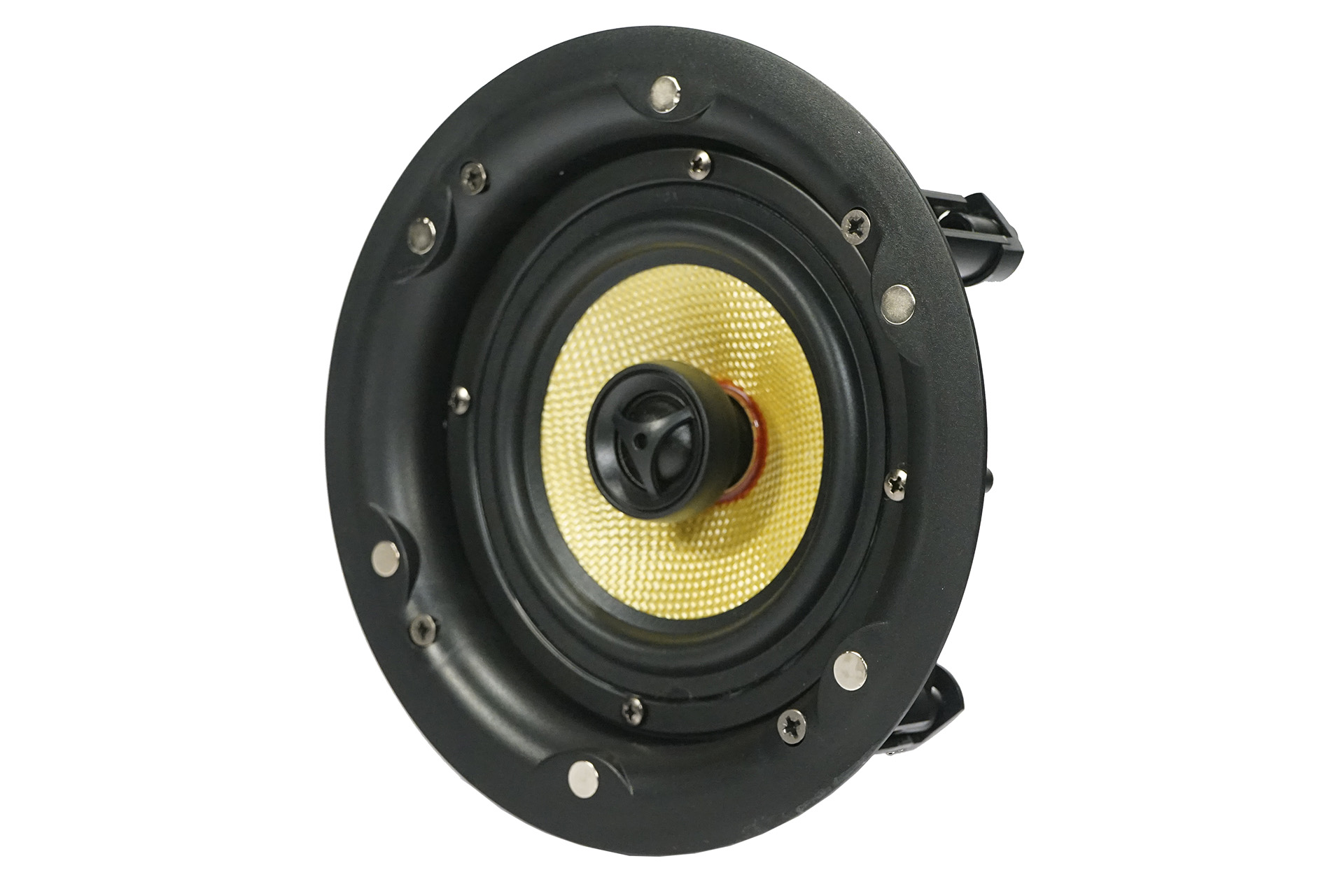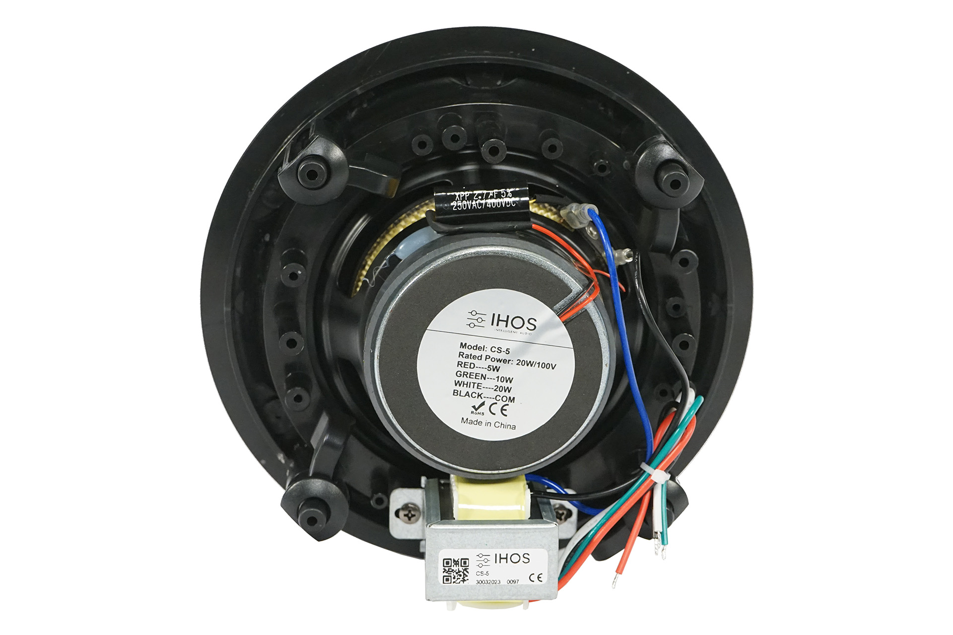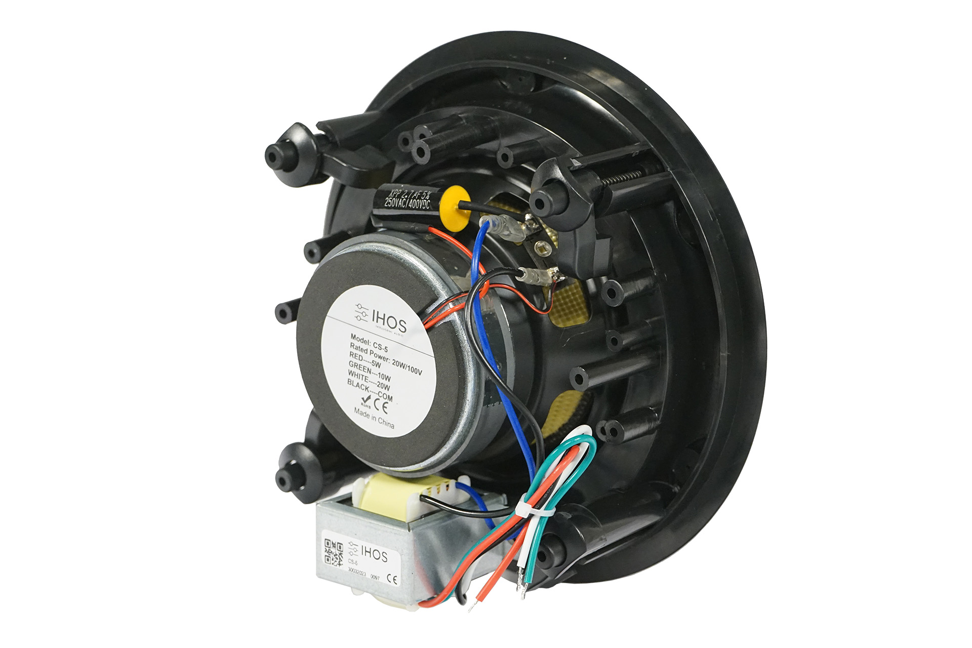 100 V Einbau-Deckenlautsprecher mit rahmenlosem ABS-Design, 5″ Koax-Kevlar-Treiber, 20 W Leistung, integriertem 100 V-Übertrager und Frequenzweiche – ideal für klare Sprach- und Musikwiedergabe in professionellen Installationen.