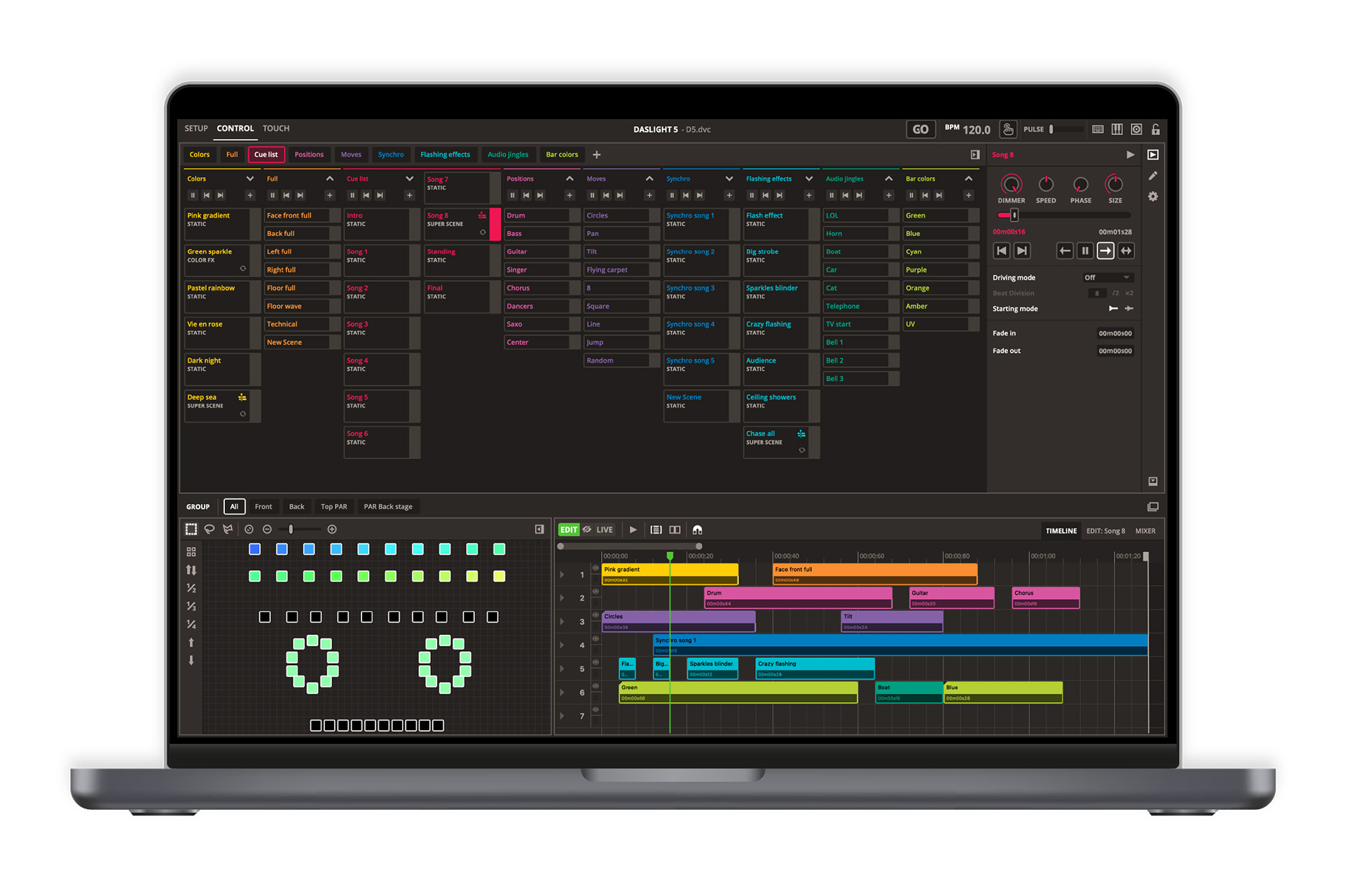 Live-Abspielen & Show-Modus: Touchscreen-freundliche Bedienung, Submaster, Gruppensteuerung, Tempo-Tap, Vollbildfunktion und individuelle Steuerbildschirme.