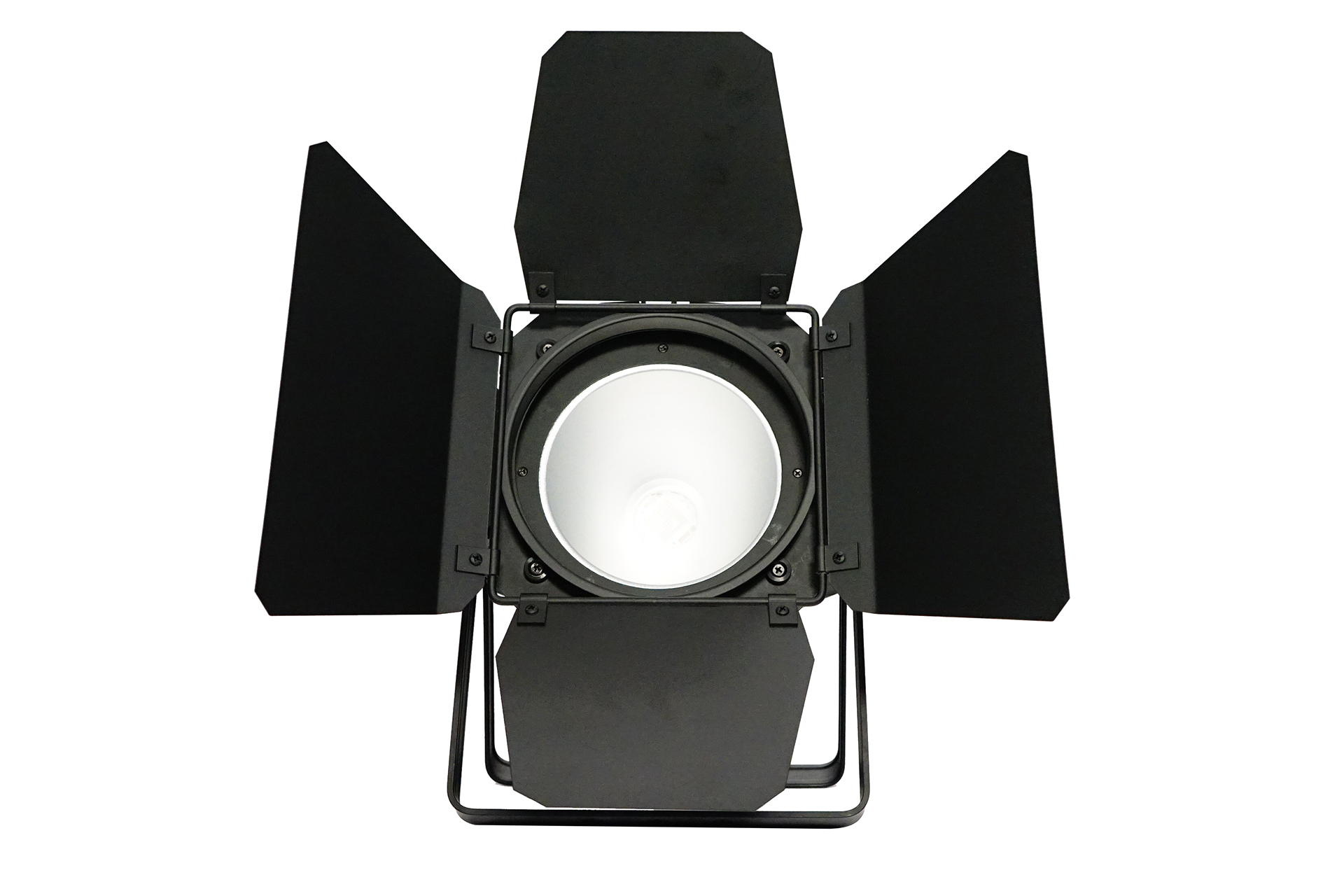 Mit seinem breiten 60-Grad-Beam liefert der Spot eine großflächige Ausleuchtung. Die stufenlose 0–100 % Dimmung erlaubt feine Abstimmungen der Helligkeit, während die mitgelieferten Barndoors das Licht präzise formen und unerwünschte Streuung minimieren. Über DMX (4 oder 8 Kanäle) lässt sich der Scheinwerfer flexibel in bestehende Setups integrieren.