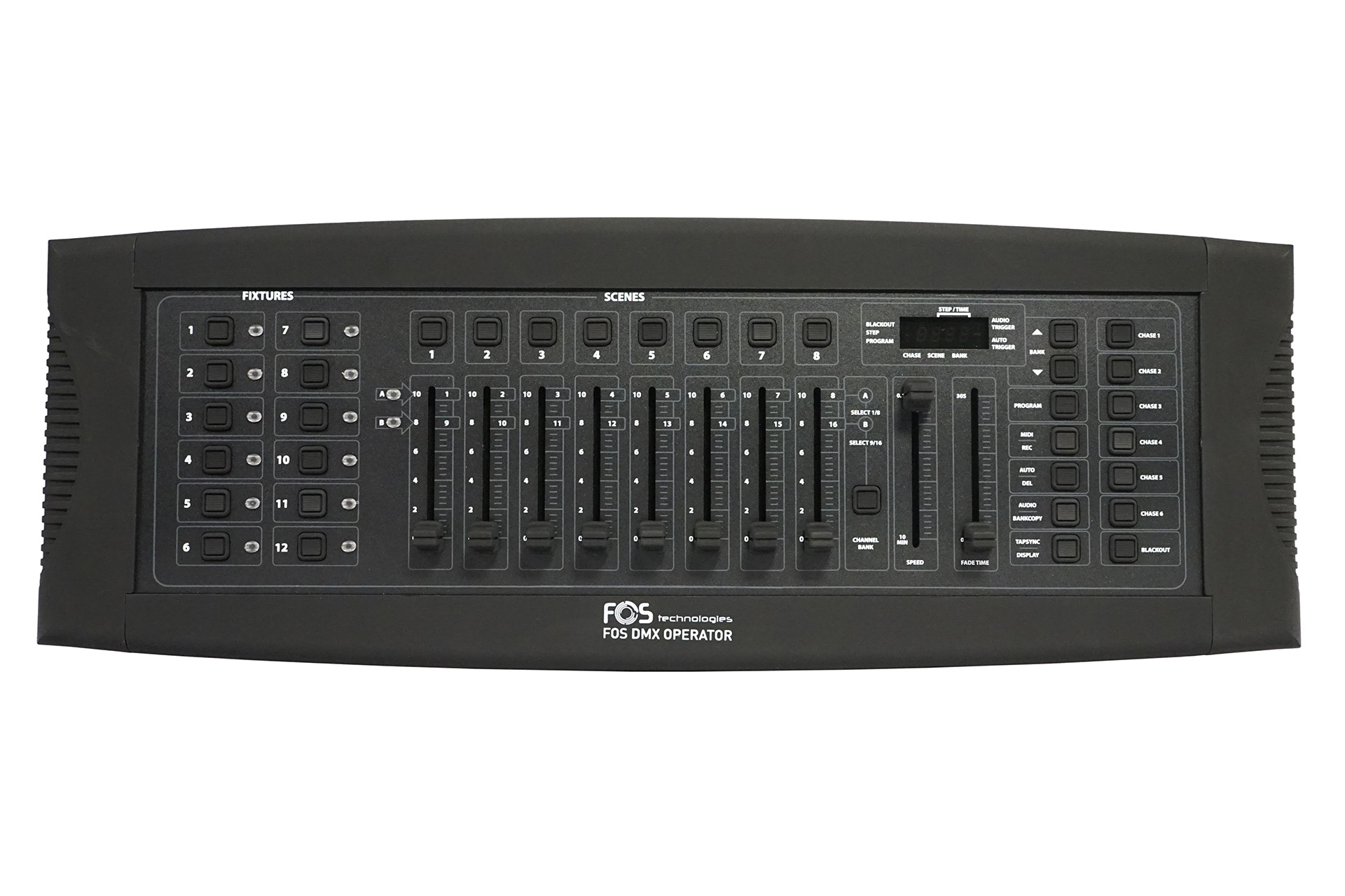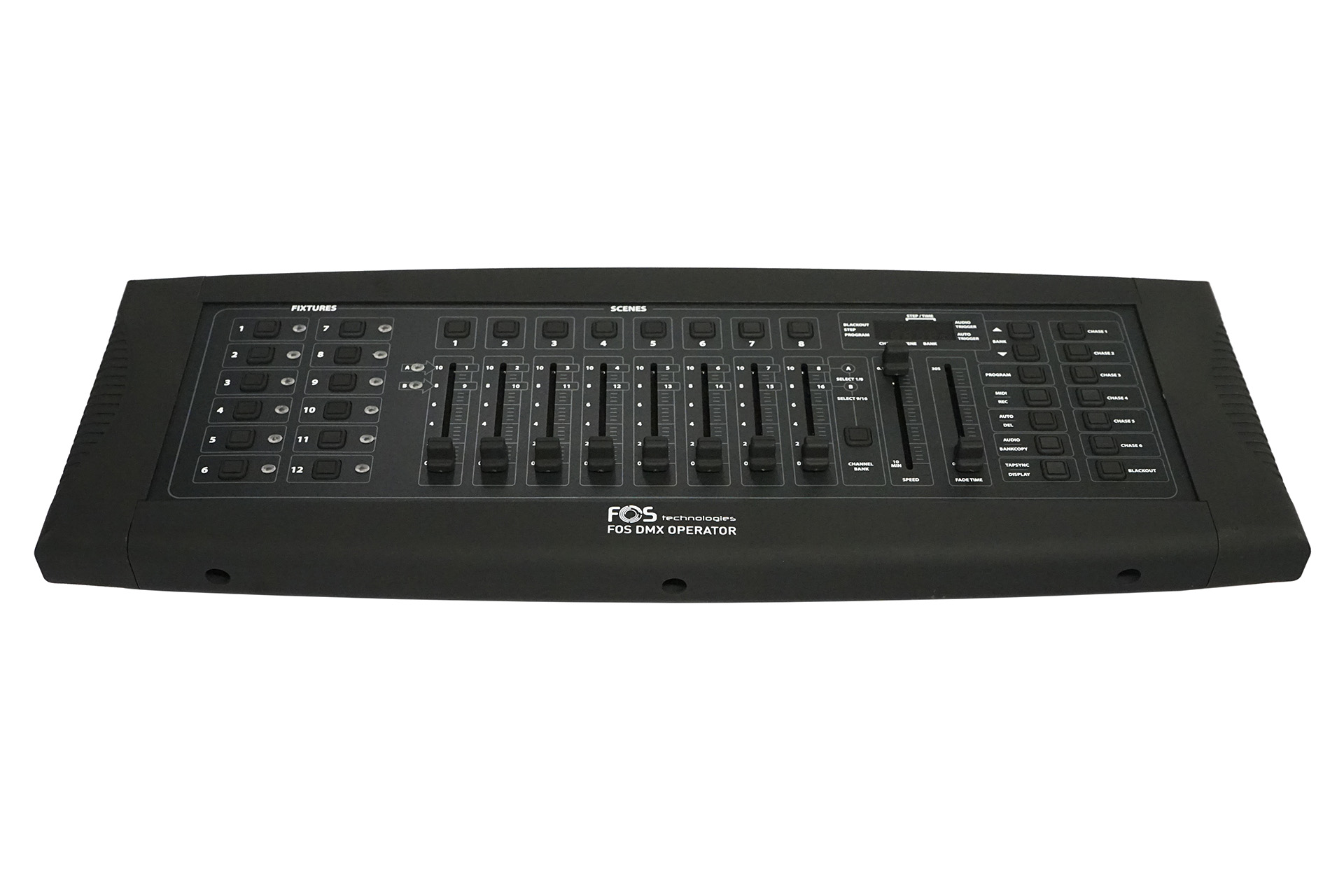 | Bedienelemente | 8 Kanal-Fader (2 Seiten), 8 Szenen-Buttons, 6 Chase-Buttons |