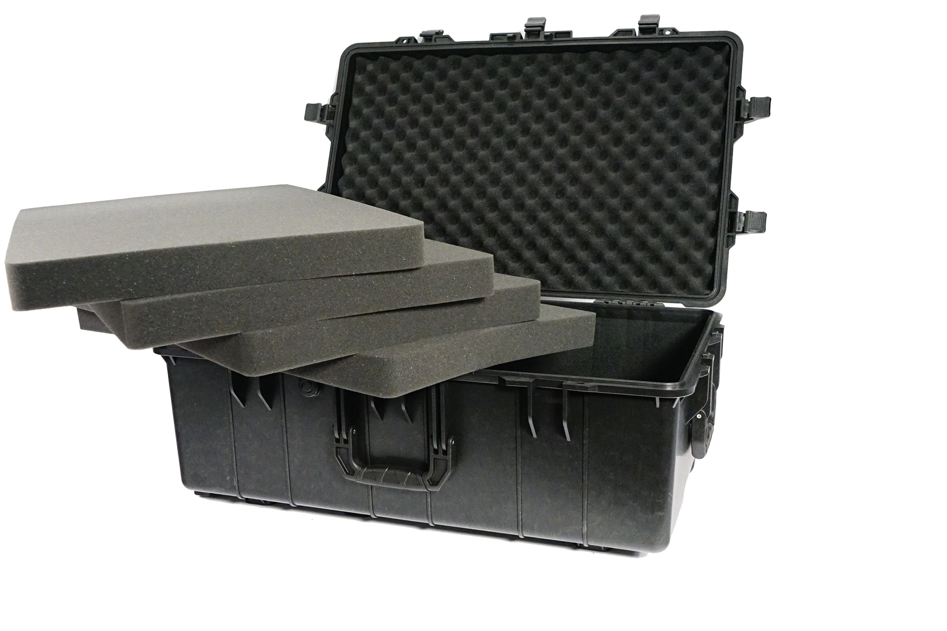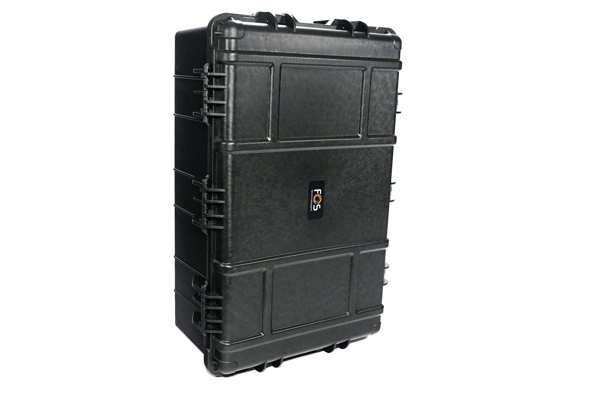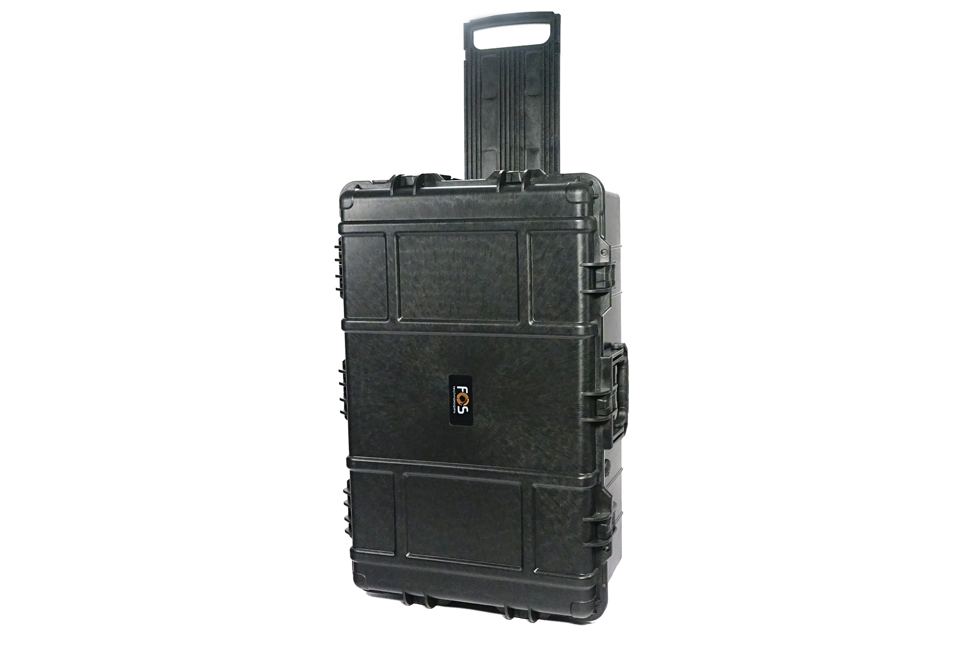 Weatherproof IP67 plastic case with wheels and folding handle for easy transport, pre cutted foam for general applications, material TSU19 resin, external dimensions 80x52x32 cm , inside dimensions 74x46x24 cm, lid depth 4.7 cm, 11 kg.