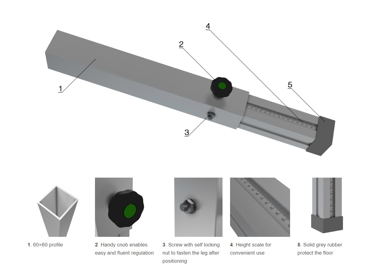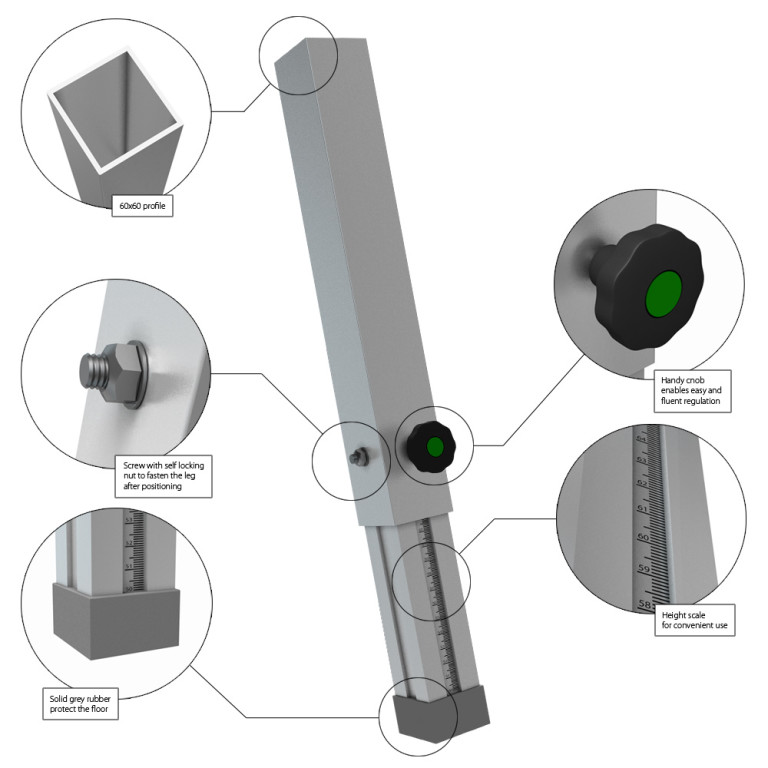 Höhenverstellbarer Bühnenpodestfuß für stabile und sichere Aufstellung von Podesten, Bühne oder Messeaufbauten. Flexibler Höhenbereich von 80-140cm. Angebot bezieht sich auf 1 Stück.