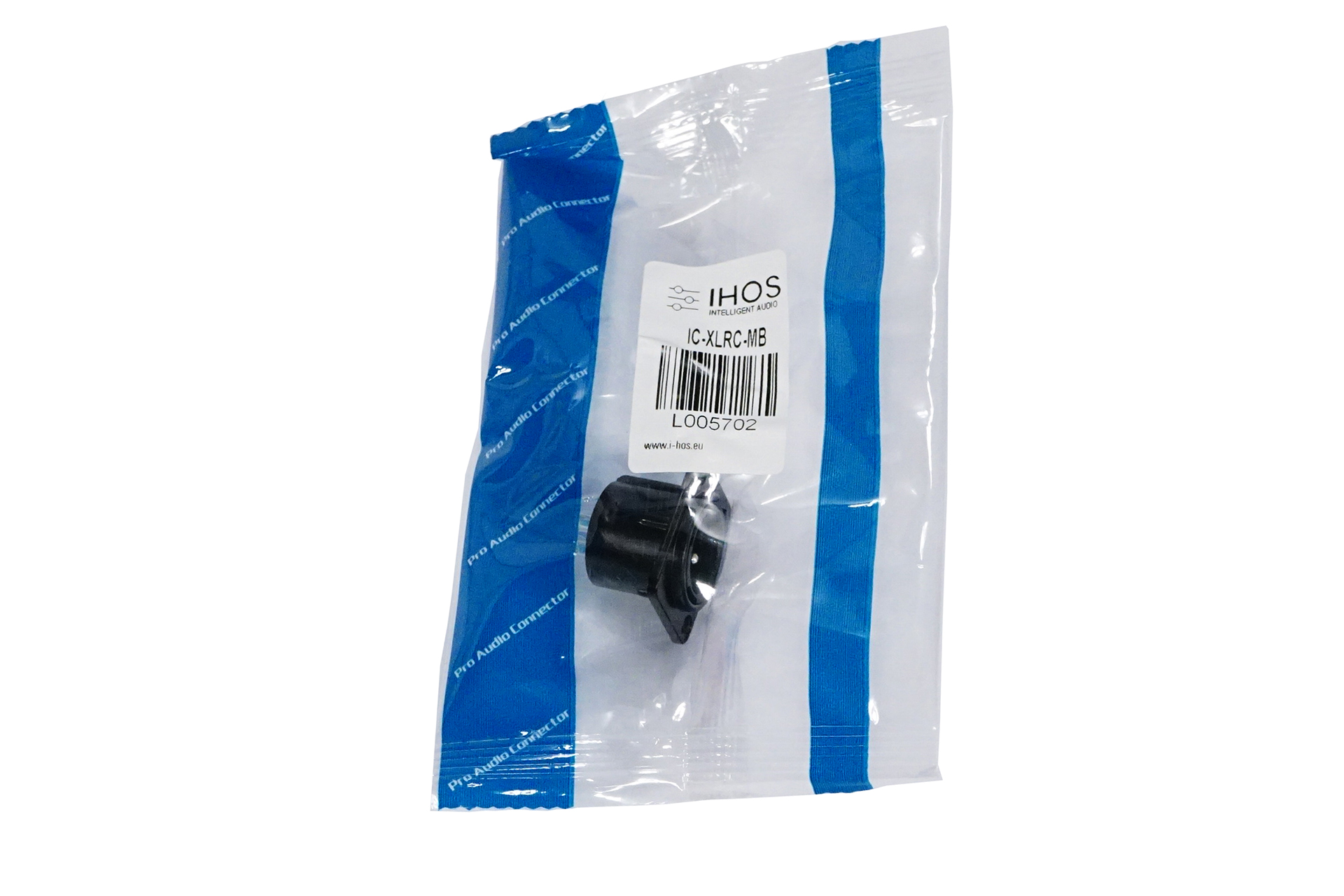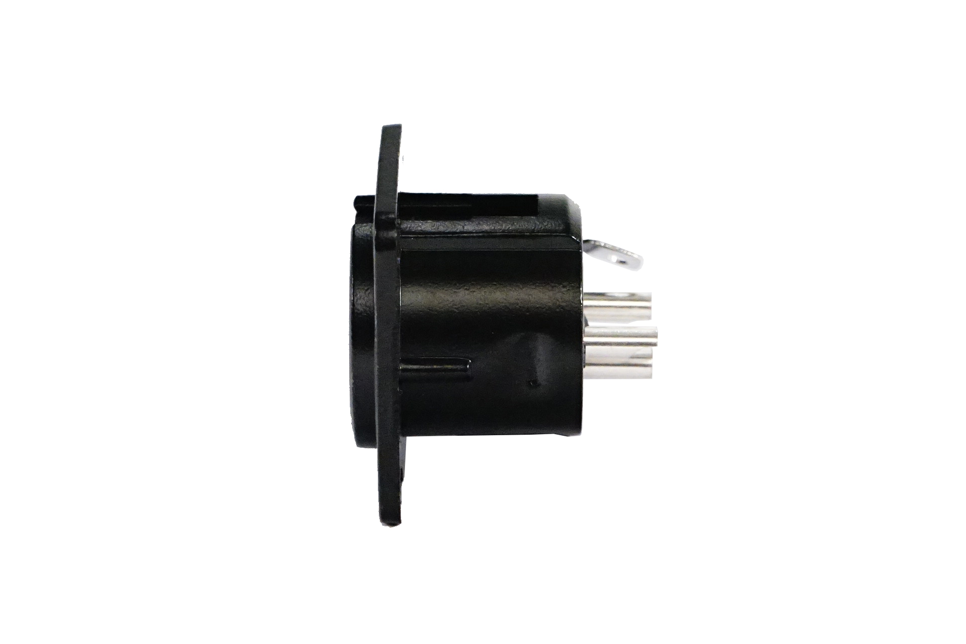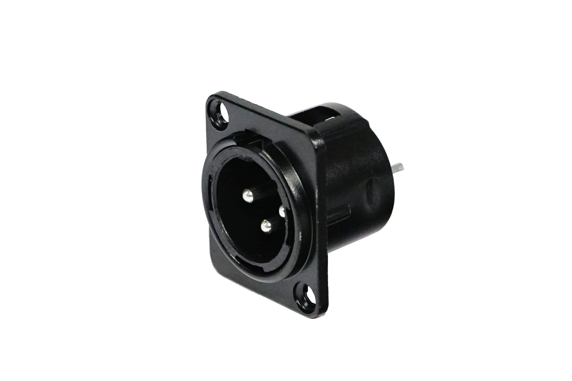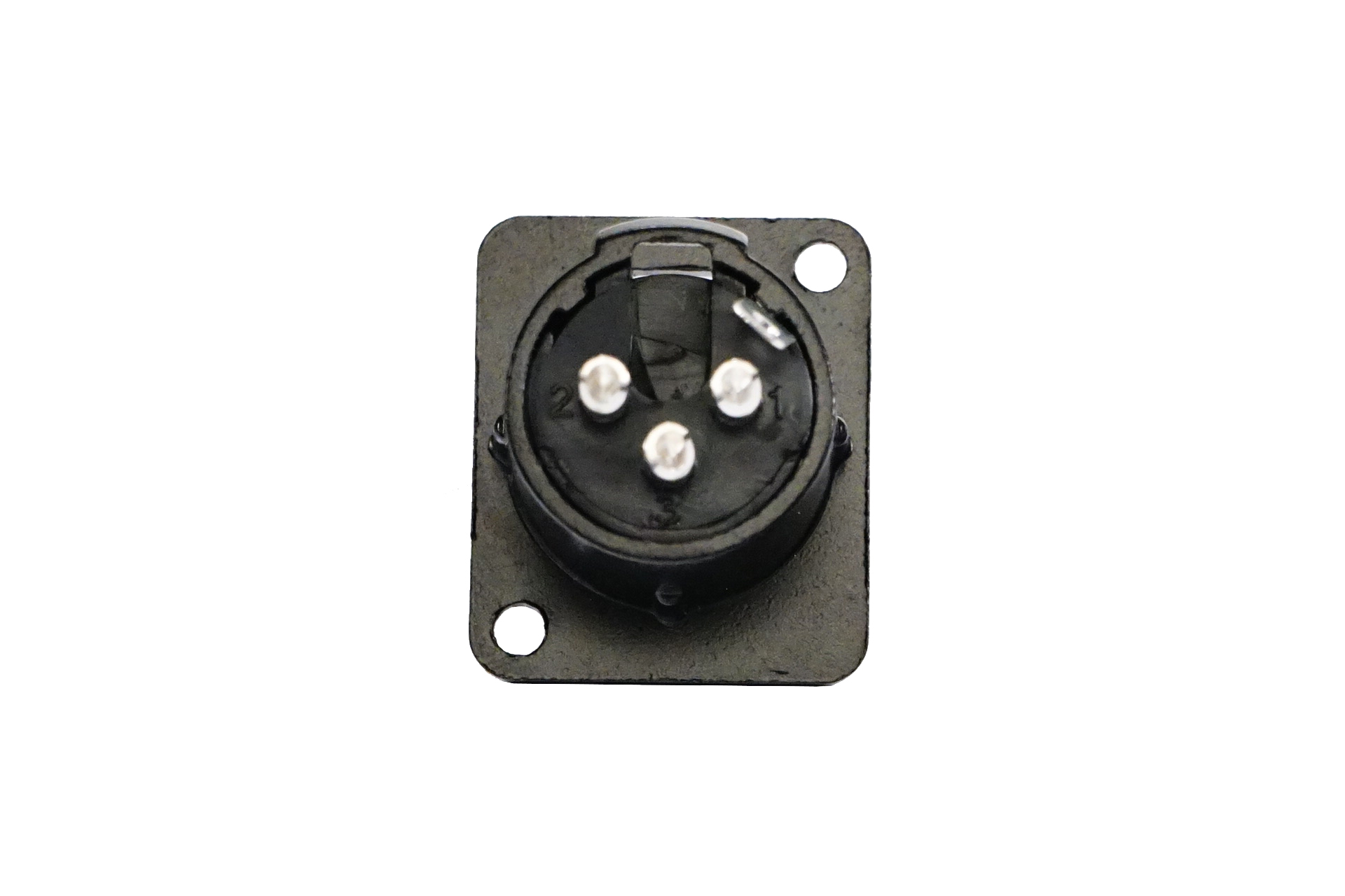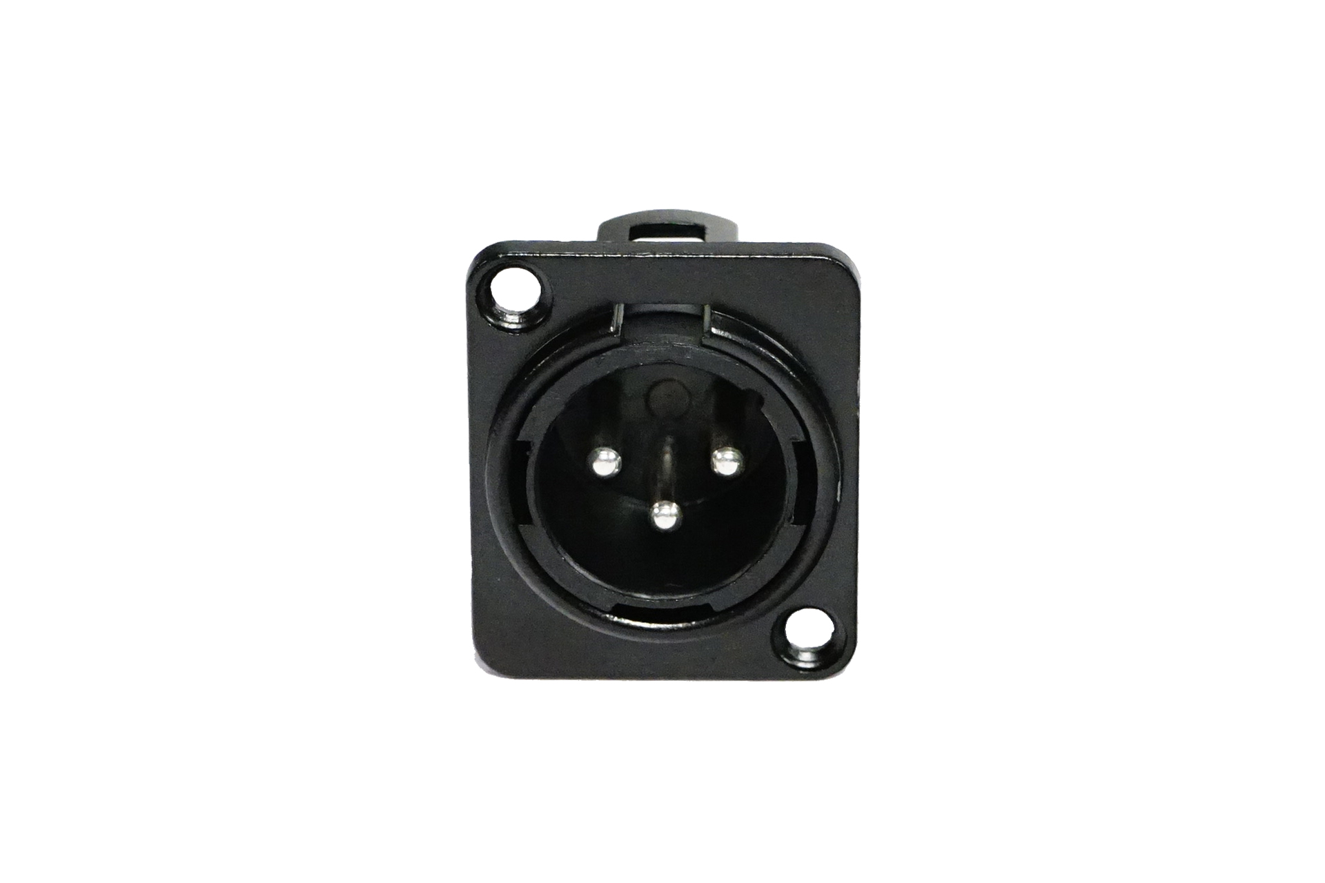 Professioneller XLR-Einbaustecker männlich mit schwarzer, vernickelter Oberfläche, Einbauloch 19–24 mm, kompakte Bauform 26 × 31 mm – ideal für Audio-, Studio- und Veranstaltungstechnik.